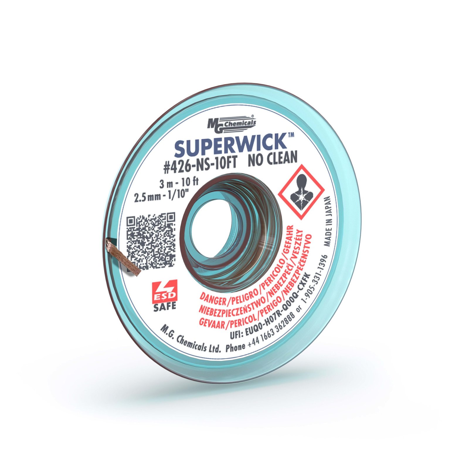 MG Chemicals 426-NS-10FT No-Clean Super Wick is a solder remover made of tightly woven, oxide-free copper braid coated with a high activation temperature no-clean flux. It has a width of 0.10-inch (2.5 mm) and length of 10 feet. The flux residue from this solder remover braid is non-conductive and non-corrosive, and therefore does not need cleaning. Its high purity and tight weave make it fast-wicking, quickly removing solder and minimizing dwell time.