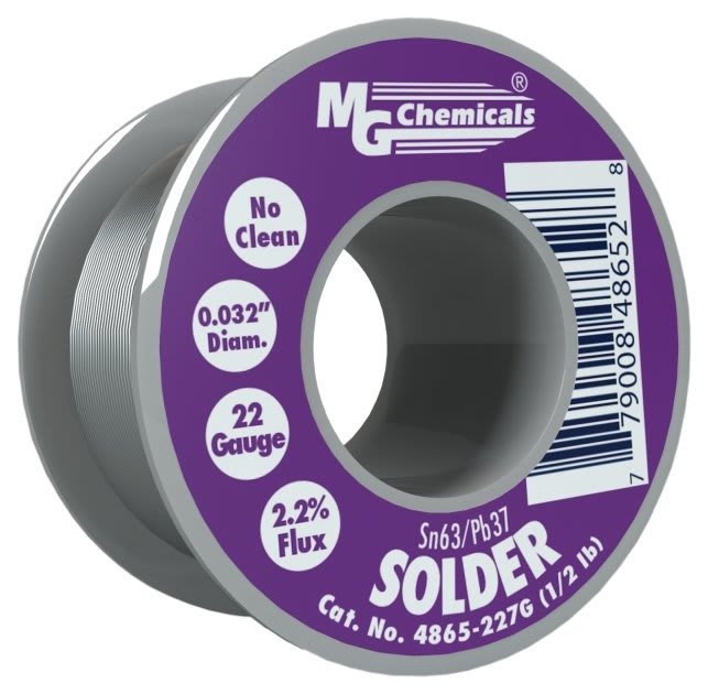 The MG Chemicals 4865 Sn63/Pb37 No Clean Solder Wire is an electronic grade solder wire. It uses the eutectic tin-to-lead alloy ratio, which is complemented with a no-clean, synthetically refined, splatter-proof, resin flux core. The solder wires meet J-STD-004B, ASTM B 32, and exceed J-STD-006C specifications. It is one of the easiest solders to work with because it offers a low-melting temperature with a sharp melting/solidification point, which results in robust and reliable joints that are highly resistant to whisker formation.