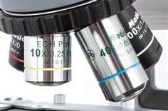 The complete series of EC Plan Achromatic objectives, from 4X to 100X magnification, is targeting an improved image contrast both for human eye and digital camera sensor through the photo port. Especially in Phase contrast, the optional objectives (positive & negative Phase) show a remarkable diversity for a wide range of applications. The N-WF eyepieces start with the standard 10X/20 mm Field of View and provide a diopter adjustment (+/-5dpt) for both eyes, ready for the use of optional reticles.
