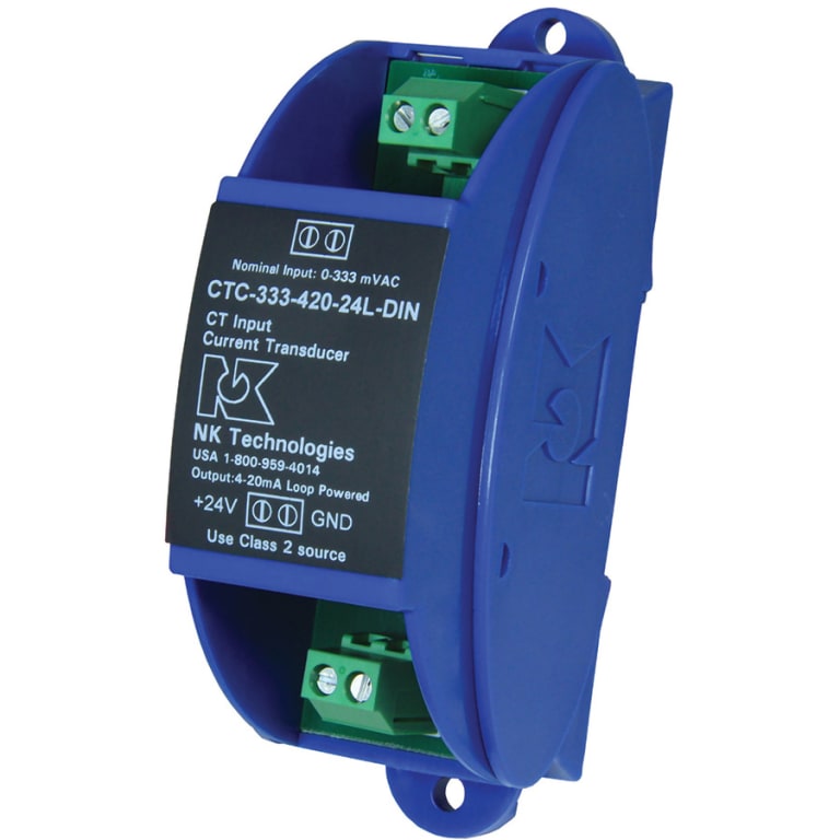 The CTC Series Signal Converters allow you to use an existing standard 5 A secondary or low-voltage ProteCT current transformer over a conductor to produce an industry standard 4–20 mA two-wire, loop powered signal. The signal is proportional to the current in the primary circuit. The CTC series signal converter snaps onto a standard DIN rail. The output is connected to the load and a 24 VDC source and the current transformer is connected.