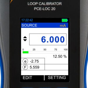In addition to the direct specification of the simulated parameters, the calibrator has a ramp mode that allows the parameters to be changed incrementally and automatically over a defined period of time. The calibrator PCE-LOC 20 can also specify the scaled process value. This means, for example, that a temperature in °C / °F is specified directly and the calibrator simulates the analog process value in mA.