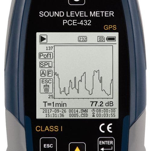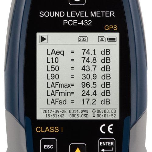 PCE-432 is a class 1 data-logging decibel meter that meets IEC 60651:1979, IEC 60804:2000, IEC 61672-1:2013, ANSI S1.4-1983 and ANSI S1.43-1997 requirements. This portable high-accuracy sound level meter is equipped with GPS functionality, allowing measured values to be assigned to an exact geographic location.