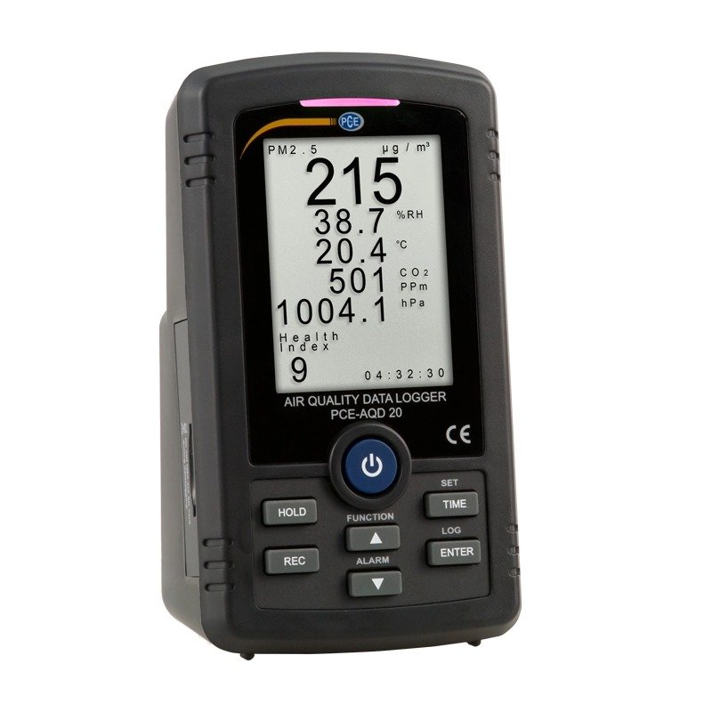 Air quality data logger for 5 parameters / Measures temperature, humidity, CO2, PM2.5 and air pressure / SD storage / XLS format / Large LCD / Power adapter and battery operation