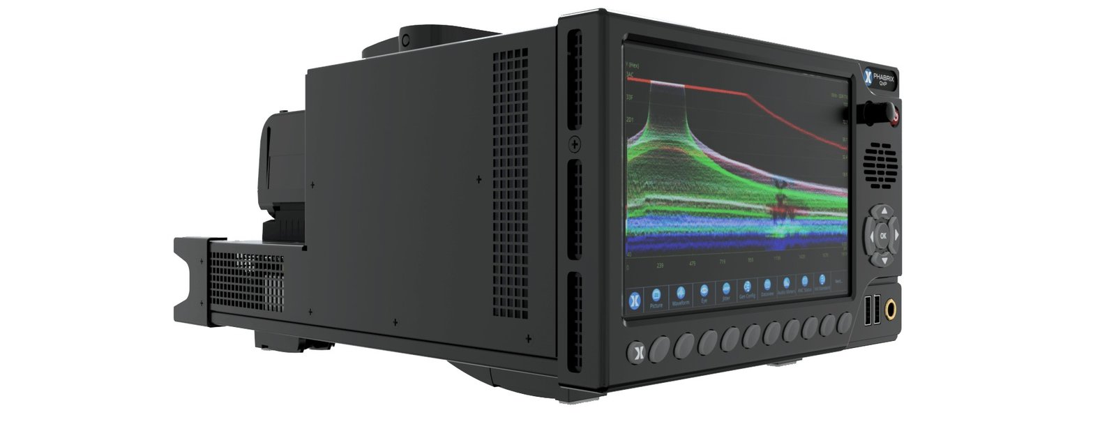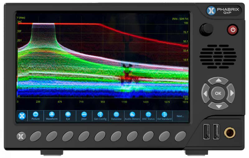 The Phabrix QxP features an integral 3U, multi-touch LCD screen with class-leading Waveforms in a portable unit. A choice of V-mount or Gold mount (G-mount) battery plate is available for portability, making the QxP equally at home on-set in SDR or HDR Productions, Grading, Shading, or QC, MCR, Engineering, and R&D environments.