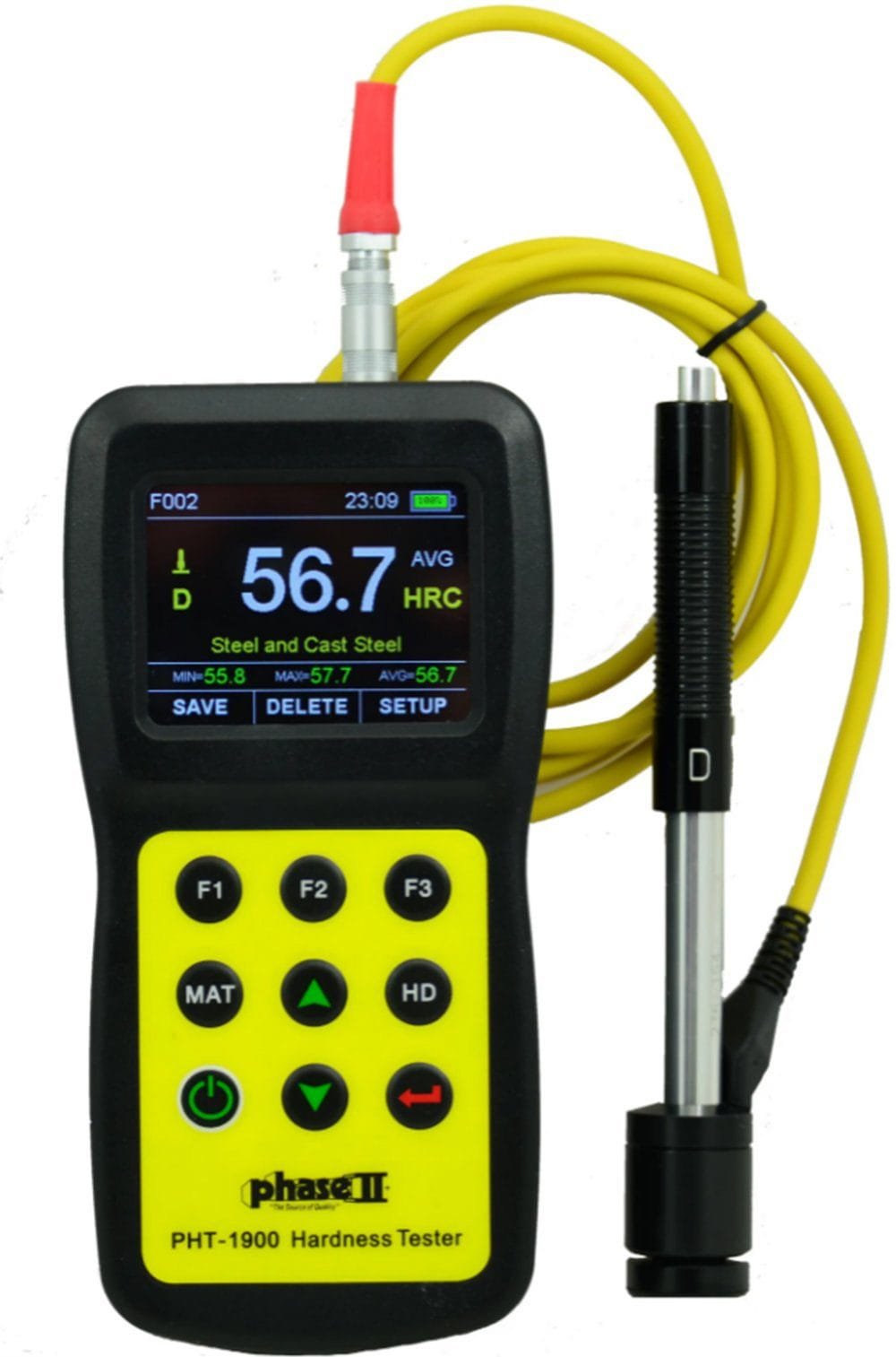 State-of-the-art, digital portable hardness tester is designed to test the hardness of large hard metal parts. The clean crisp display shows the incredible functions that can only be found on this new portable hardness tester such as auto-probe detection, auto direction detector, and single and multi-point calibration making the new 1900 the most versatile portable hardness tester in the industry. Blazing fast test speeds coupled with memory and output, this unit is a must-have for virtually any workshop.