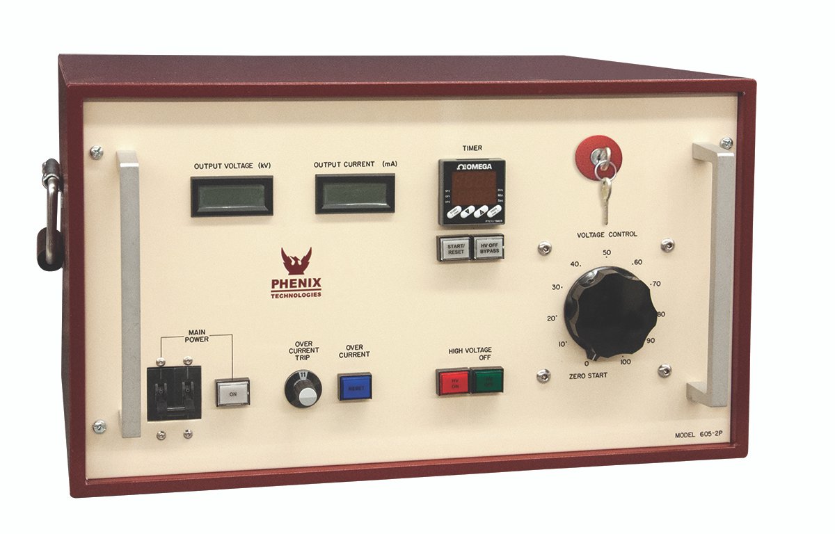 The Phenix line of 5 kV-15 kV AC Hipots offer a completely integrated, easy-to-use high voltage AC supply. The air insulated high voltage transformer, controls and regulator are housed either in a painted steel benchtop enclosure or for the larger units in a free-standing steel enclosure.