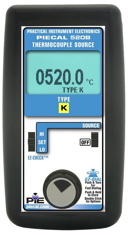 The PIECAL 520B Thermocouple Simulator simulates a dedicated standard thermocouple curve over the entire industrial temperature range. The PIECAL 520B provides precise temperatures for inputs to all types of instruments such as transmitters, recorders, controllers, alarms, data acquisition, and computer systems. PIECAL 520B is cold-junction compensated for changes in ambient temperature. The PIECAL 520B offers the highest performance and functions in its class by exceeding the accuracy and functions of many higher priced thermocouple calibrators.