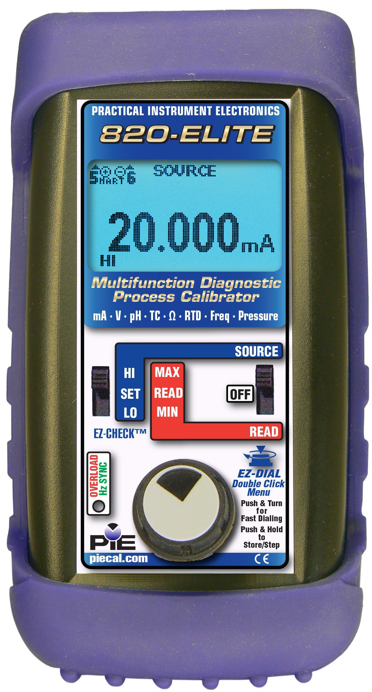 PIE Model 820ELITE – Multifunction Diagnostic Calibrator – Sources & Reads mA, T/C, RTD, V, mV, and Frequency. Also Sources pH, Includes a Continuity Checker, Accepts Pressure Modules and has Loop Diagnostic Capabilities.
