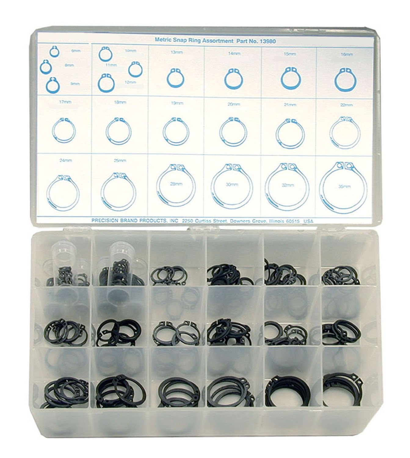 External, black phosphate coated, metric size, spring steel snap ring. Used to retain pulleys, gears, or wheels on shafts. Handy kit for shop toolroom or toolbox. On hand when needed saves time and money. Plastic compartment box is easy to store. The Precision Brand® 295 Piece Metric Snap Ring Asst contains: 25 – 6mm; 20 – 8mm; 15 – 9mm; 20 – 10mm; 20 – 11mm; 20 – 12mm; 10 – 13mm; 20 – 14mm; 15 – 15mm; 20 – 16mm; 10 – 17mm; 15 – 18mm; 10 – 19mm; 15 – 20mm; 10 – 21mm; 10 – 22mm; 10 – 24mm; 10 – 25mm; 5 – 28mm; 5 – 30mm; 5 – 32mm; and 5 – 35mm.