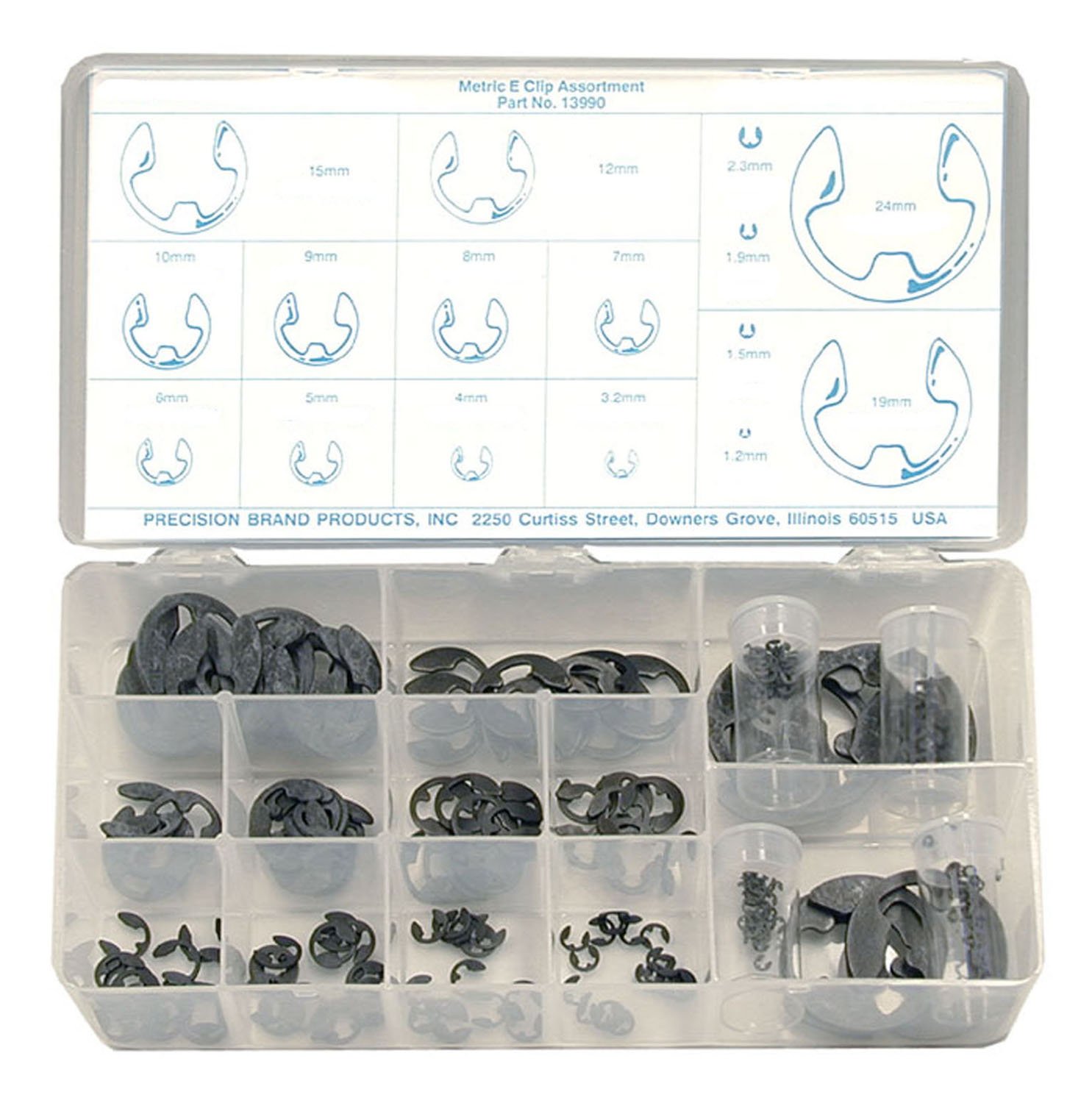 External metric size clips are made of steel. Retain positive retention of pulleys, sprockets, springs, and bearings on shafts and rods handy kit for shop toolroom or toolbox. On hand when needed saves time and money. The plastic compartment box is easy to store. The Precision Brand® 255 Piece Metric E-Clip Asst contains: 35 – 1.2mm; 30 – 1.5mm; 30 – 1.9mm; 25 – 2.3mm; 20 – 3.2mm; 15 – 4mm; 15 – 5mm; 15 – 6mm; 10 – 7mm; 10 – 8mm; 10 – 9mm; 5 – 10mm; 10 – 12mm; 15 – 15mm; 5 – 19mm; and 5 – 24mm.
