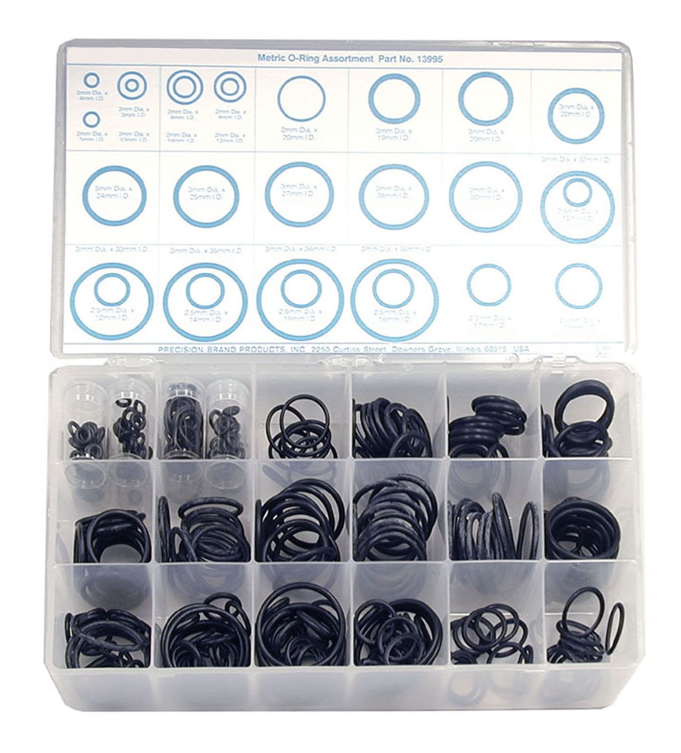 Made of BUNA-N 70 durometer rubber compound. Creates a tight seal for fluid or gas connections. Handy kit for shop toolroom or toolbox. On hand when needed saves time and money. Plastic compartment box is easy to store. The Precision Brand® 350 Piece Metric O Ring Asst contains: 15 – 2mm x 3mm; 15 – 2mm x 4mm; 15 – 2mm x 5mm; 15 – 2mm x 6mm; 15 – 2mm x 8mm; 15 – 2mm x 10mm; 15 – 2mm x 12mm; 10 – 2mm x 14mm; 10 – 2mm x 20mm; 15 – 2.5mm x 10mm; 15 – 2.5mm x 12mm; 15 – 2.5mm x 14mm; 15 – 2.5mm x 15mm; 15 – 2.5mm x 16mm; 10 – 2.5mm x 17mm; 10 – 2.5mm x 19mm; 15 – 3mm x 19mm; 15 – 3mm x 20mm; 15 – 3mm x 22mm; 15 – 3mm x 24mm; 10 – 3mm x 25mm; 10 – 3mm x 27mm; 10 – 3mm x 28mm; 10 – 3mm x 30mm; 10 – 3mm x 32mm; 5 – 3mm x 33mm; 5 – 3mm x 35mm; 5 – 3mm x 36mm; and 5 – 3mm x 38mm.