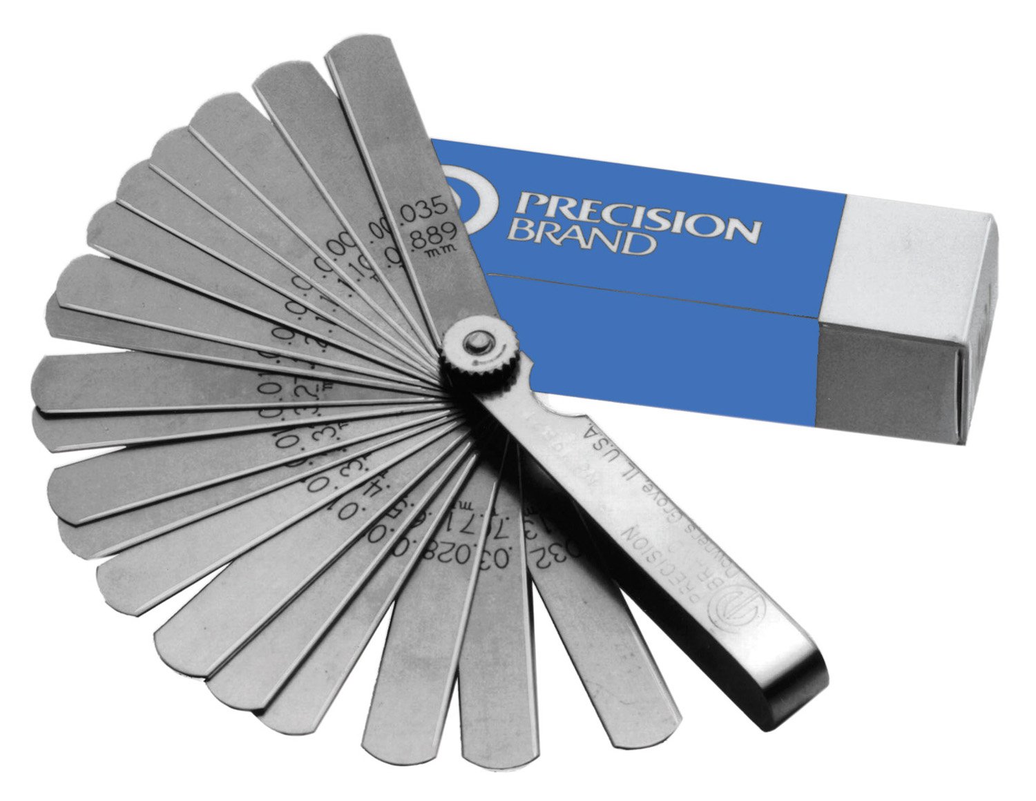 Contains twenty-five 3″ long by 1/2″ wide blades in varying thicknesses. 0.0015″, 0.002″, 0.003″, 0.004″, 0.005″, 0.006″, 0.007″, 0.008″, 0.009″, 0.010″, 0.011″, 0.012″, 0.013″, 0.014″, 0.015″, 0.016″, 0.018″, 0.020″, 0.022″, 0.024″, 0.025″, 0.028″, 0.030″, 0.032″, and 0.035″. Heavy-duty swivel holder. Sizes etched on each blade. Rounded ends for safety. Precision Brand® Feeler Gage is used in manufacturing and maintenance operations wherever setting close spacing or checking extremely tight tolerances is required.