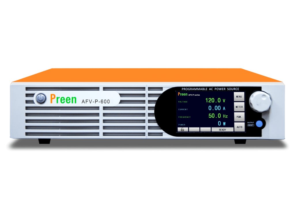 The Preen AFV-P series comprises measurement features of rms voltage, rms current, true power, apparent power, power factor, crest factor, reactive power etc. The 5in touch screen with rotary knob allows quick adjustments and configurations of voltage, current and frequency. A total of 1200 test steps in 50 built-in memories and transient generation functions allow simulations of voltage variations, surges, drops and frequency disturbances. Users can set start and end phase angle from 0 to 359 degrees, and remotely control AFV-P series via standard interfaces. Free control software and LabVIEW driver are available for easy programming and remote control.