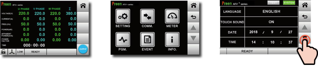 The AFV+ series employs 7″touch screen to provide intuitive and easy-to-use control and display. Users can quickly access output settings and measurements, including voltage, current, frequency, real power, apparent power, PF and sum of each phase’s parameters. Complex sequences and system configurations can also be easily done via the touch screen.