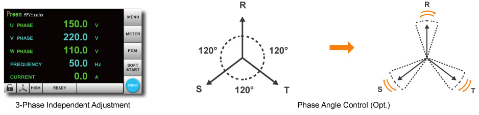 - Via the Three Phase Independent Adjustment function, the AFV series can deliver each phase voltage differently to multiple single-phase DUTs