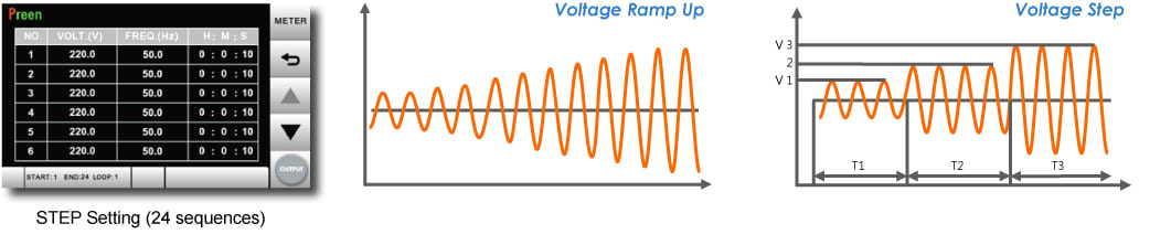 The AFV+ series’ RAMP feature has up to 12 sequences available with parameters of voltage, frequency and time, and the STEP feature has up to 24 sequences available with parameters of voltage, frequency and time. These features provide an easy method to simulate different kinds of power line disturbance.