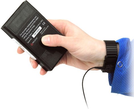 The PFM-711B Fieldmeter case is conductive. It provides the ground reference for its measuring circuit. For accurate measurements, it is necessary that the person holding the meter be properly grounded, or the meter has a ground connection made to the 10 mm snap fastener mounted on the back of case. Ground the case by wearing a functional wrist strap that is properly grounded. Turn the meter on and select the desired range. Adjust the display to zero (0) volts by pressing the ZERO control.