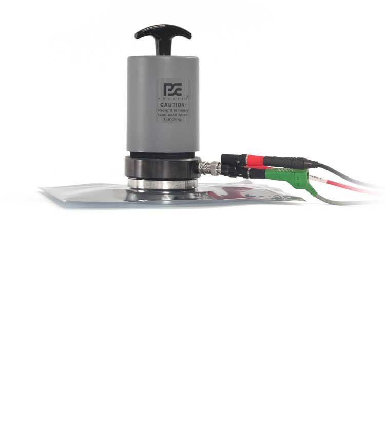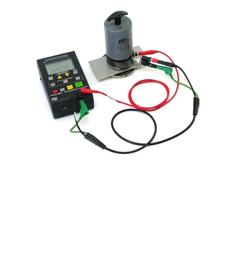 This ESD Packing Test Kit will accurately measure resistance from less than 100 ohms (<1.0×102 ohms), to greater than 1.0×1012 Ohms (>1.0×1013 ohms/square). The PRF-911 is designed so that it can be connected to either the ground reference of the PRS-801B or earth ground to minimize the effects of extraneous fields and charges on the measurement.