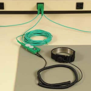 The Prostat PGC-015G is a 15 foot straight common point ground cord with two banana receptacles, in low profile housing for connecting two wrist straps. The PGC-015G includes one 1.0×106 (±20%) current limiting resistor molded in the snap housing, a low profile housing with a 10 mm male snap for easy connection to mat, a male banana plug for cord connection to ground.