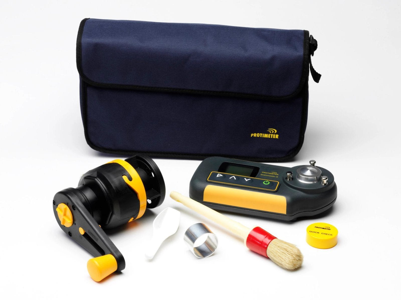 The Protimeter Grainmaster i2 is supplied in a pouch with grinder compressor unit, grain cup, sample spoon, brush and ‘Quickcheck’.