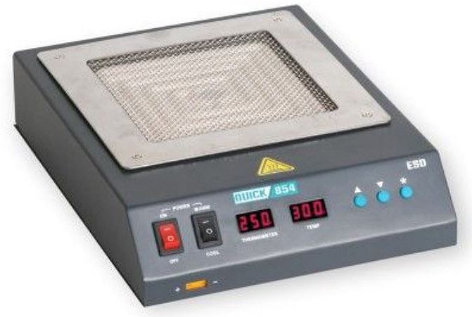 The Quick 854 is a 400 watt infrared preheater with 5.1 x 5.1 inch heating area. The 854 has a temperature range of 125-660°F, stability of ±1°, as well as a built-in thermometer for checking the temperature of your PCB. Its long life, ceramic heater provides fast heating and high efficiency and is a great addition to any electronics workbench.