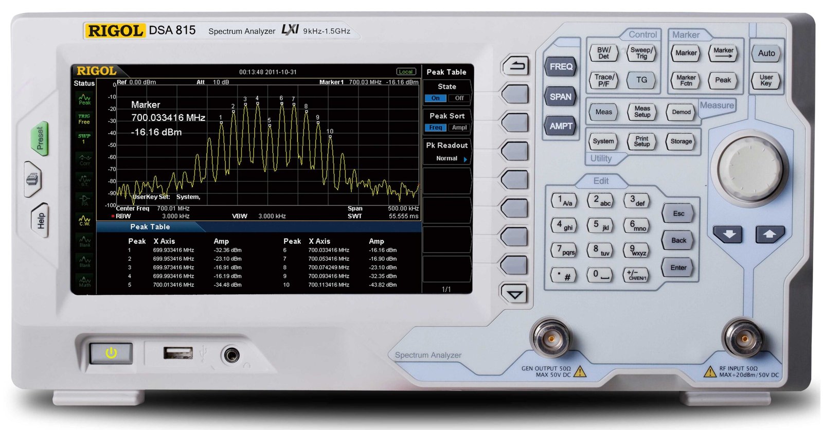 The very large display (20.3 cm / 8″) of the Rigol DSA815 Spectrum Analyzer with a resolution of 800x480pixels provides a very good overview over all its comfortable functions like Auto Tune, Auto Range, Auto Scale and Auto Couple. These functions enable the analyzer to acquire signals and match parameters automatically, instead of the manual process necessary with a traditional analyzer.
