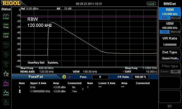 EMI-DSA800 option provides Quasi-Peak detector and EMI filter (200 Hz, 9 kHz, 120 kHz, -6 dB bandwidth). Quasi-Peak detection is a weighted form of peak detection. For each data point, the detector detects the peaks within the specified time interval, weights the peaks detected using circuit with specified charge and discharge structures as well as the display time constant specified in the CISPR Publication 16 standards and display the result.
