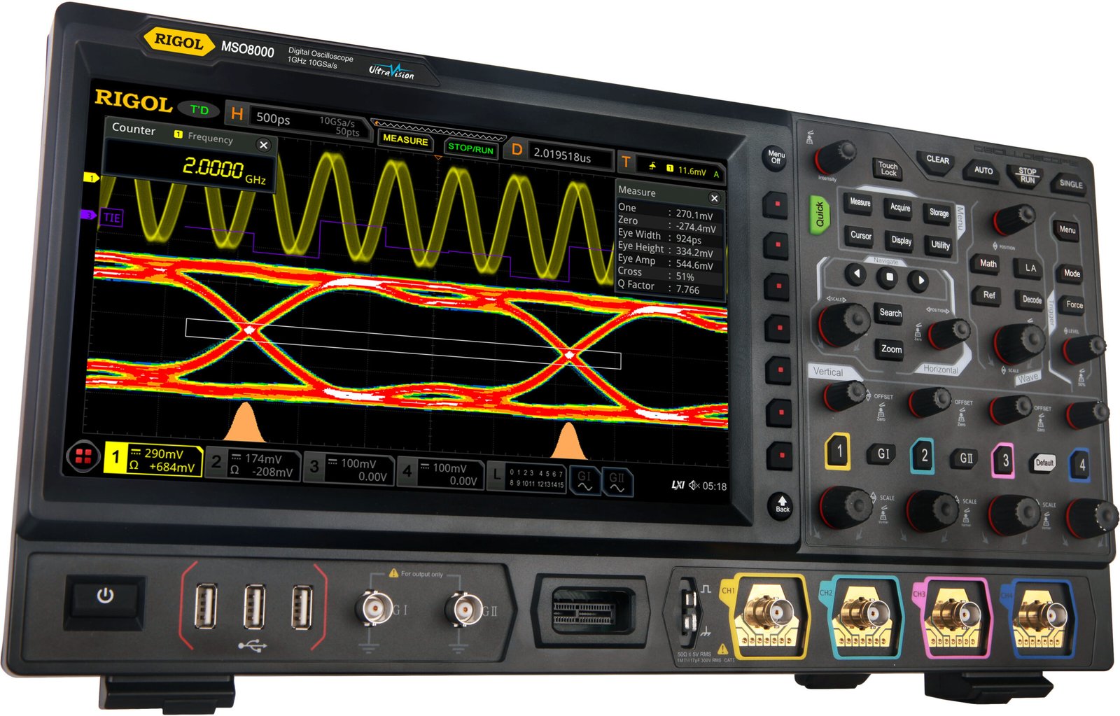 Rigol’s new MSO8000 is a high performance digital oscilloscope based on its proprietary ASIC chip and UltraVision II platform. Integrating 7 independent instruments into 1, the MSO8000 features analog bandwidth upgradable to 2 GHz, extremely high memory depth of 500 Mpts, sound waveform display effects, excellent waveform capture rate, and powerful data analysis functions. Many of its specifications are equal to top competitors in the industry.