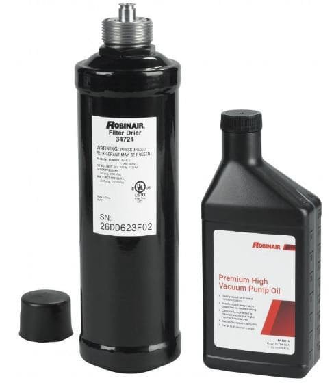 Keep recovery and recycling units operating at peak efficiency with a convenient 13172 maintenance kit from Robinair. It contains one quick change filter-drier to be used on both R-12 and R-134a stations, and one 16 ounce bottle of our Premium High Vacuum Pump Oil.