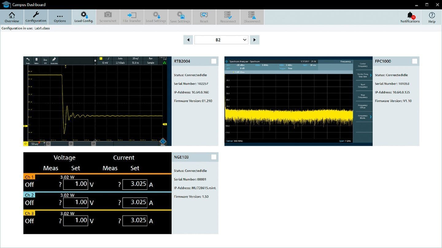 View all instruments on one bench on your computer screen using the R&S CDS campus dashboard software; the software also supports remote control of each instrument