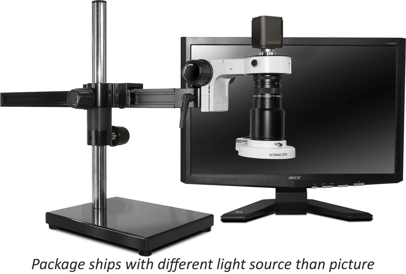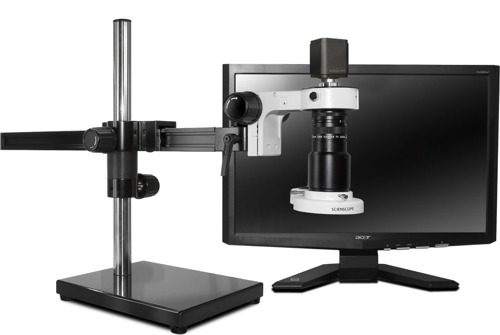 MACRO video zoom optics (up to 65x magnification with 8 inch working distance) on gliding arm boom stand withdiffused LED dome light.1080p Auto-focus camera (Includes SD Card, HDMI cable, and mouse) with 23 inch HD LCD monitor and capture software.
