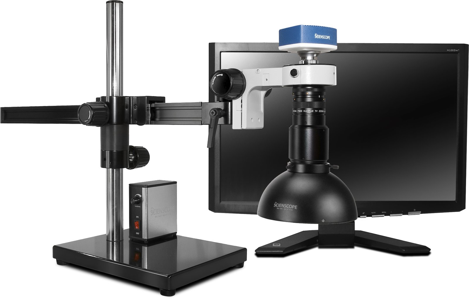 MACRO video zoom optics (up to 65x magnification with 8 inch working distance) on gliding arm boom stand withdiffused LED dome light. Features1080p HDMI/USB camera (Includes SD card, HDMI cable, USB cable and mouse) with 23 inch HD LCD monitor and capture software.
