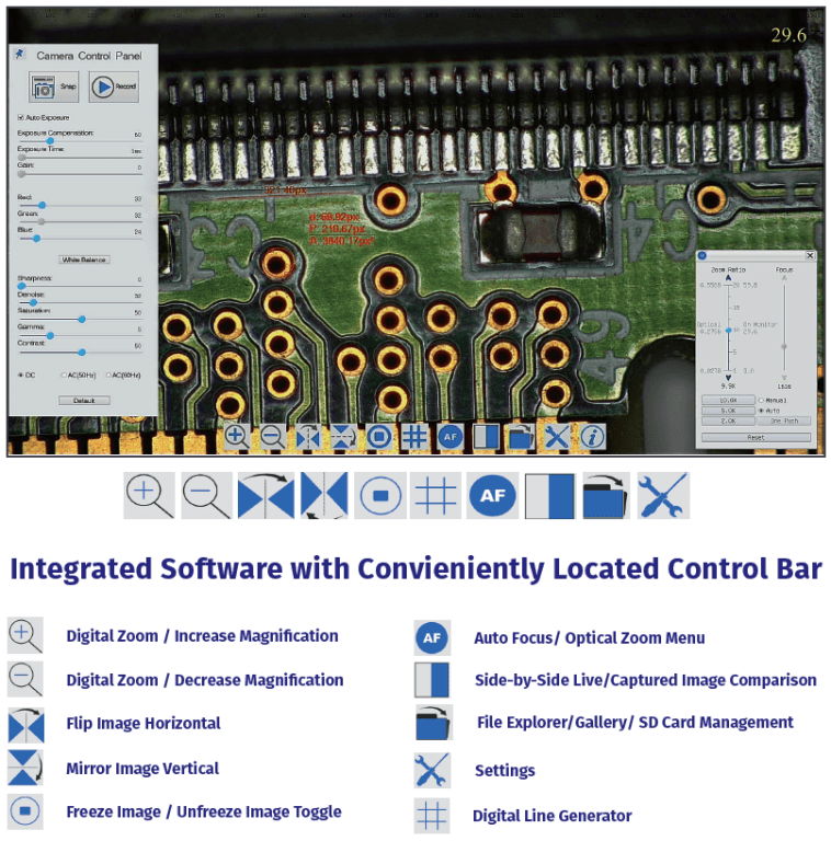 The All-One Camera is an advanced all-in-one inspection solution—all you need to inspect or convert a microscope system into a powerful digital inspection tool. All-One(AO)includes internally controlled optics, integrated image processing and capture software, with an onscreen magnification display, integrated LED lighting, and amounting adapter.