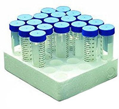 Graduations on clear tubes are printed in bold easy-to-read black ink and are accurate to ± 2%. 50mL clear tubes include a black printed 50mL graduation line and 1, 2 and 3mL graduations molded into the conical bottom. Large white marking area provides excellent contrast for identification. All tubes are manufactured from high quality polypropylene and have smooth, flat surface polyethylene (HDPE) caps. Maximum RCF is 16,000g. Temperature range of -80°C to 120°C. 50mL clear tubes are available in recyclable racks or bulk packaged in zip-closure bags. Sterile (gamma irradiated). Subdivisions – 2.5mL.