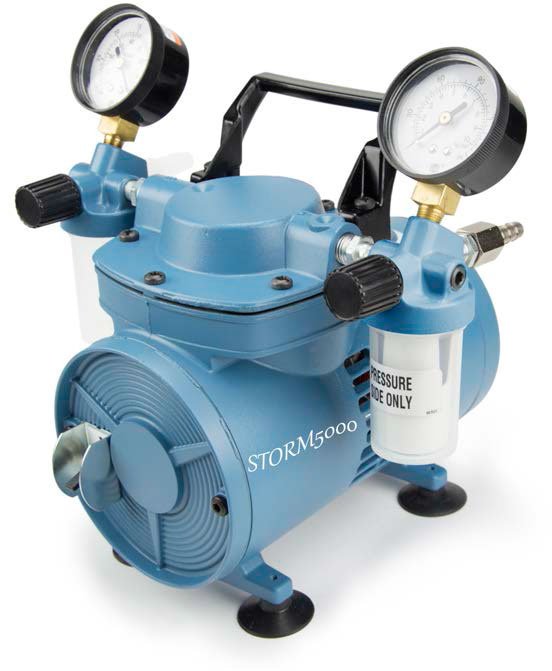 The STORM5000 has free air displacement at 115V, 60Hz and a maximum vacuum of 24″Hg (200 mbar). The STORM5000C has free air displacement at 230V, 50Hz and a maximum vacuum of 24″Hg (200 mbar). They are recommended for operations utilizing organic/aqueous solvents and/or light acid/base solutions. They are recommended for operations utilizing organic/aqueous solvents and/or light acid/base solutions and can also be used to pressurize up to 18 PSIG.
