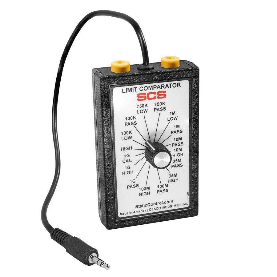 The frequency of re-calibration should be based on the critical nature of those ESD-sensitive items handled and the risk of failure for the ESD protective equipment and materials. In general, SCS recommends that calibration be performed annually. Use the SCS 770769 Limit Comparator to perform periodic verification (once every 6-12 months) of the SCS 770758 Dual Combination Tester. The Limit Comparator can be used to check the test limits of the Dual Combination Tester without removing it from the factory floor.
