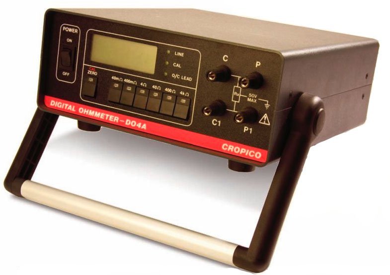 The DO4A is a practical instrument for low resistance measurement, ideal for use in the workshop, field or test facilities. It is of rugged construction contained in an aluminium case with tilt handle. The DO4A has many advanced features, including protection up to 415 volts rms, digital calibration and long scale length (4000 count). The rechargeable sealed lead acid battery means real portability with more than 14 hours continuous operation, without the problems normally associated with other battery types. Full measurement capability is maintained while charging. For ease of operation the control functions have been kept to a minimum and are clearly marked. It is of course direct reading, warning LEDs illuminate when an open circuit lead condition is detected. Over range and low battery indication is also provided. The DO4A is supplied ready for immediate use with battery, mains cord and measuring leads, no extras are normally necessary. The 15mm LCD provides easy viewing and the instrument can be used in any position for many and varied applications. The test leads provided have a length of 1 metre with spade tags for connection to the ohmmeter terminals. They are terminated in combined current and potential probes that will accept conductor diameters up to 0.24in.