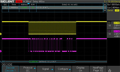 SDS2000X-E displays the decoding through the events list. Bus protocol information can be quickly and intuitively displayed in a tabular format.