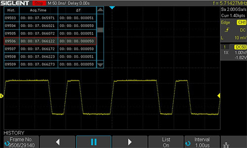 Playback the latest triggered events using the history function. Segmented memory collection will store trigger events into multiple (Up to 80,000) memory segments, each segment will store triggered waveforms and timestamp of each frame.