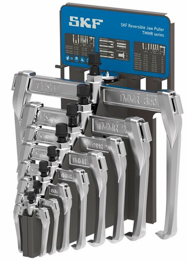 The multi-purpose SKF Reversible Jaw Pullers are suitable for internal and external pulling of bearings and other components, such as gears and pulleys. The standard range of eight pullers can accommodate a wide range of bearing and component sizes. Adding extra versatility to the TMMR..F puller programme, the four largest sizes are also available with extra long arms as a standard option (TMMR ….XL). The extra long arms help to dismount bearings and components placed far from the shaft end. For more versatility, the extra long arms can be further extended by adding extension pieces.