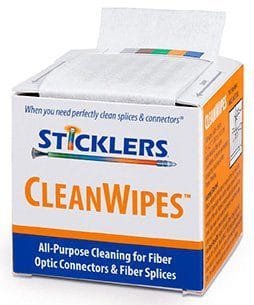 While these static-dissipative wipes can be used dry, users also can enjoy the improved cleaning results from wet-dry wipes with the Sticklers Fiber Optic Splice & Connector Cleaner Fluid.
