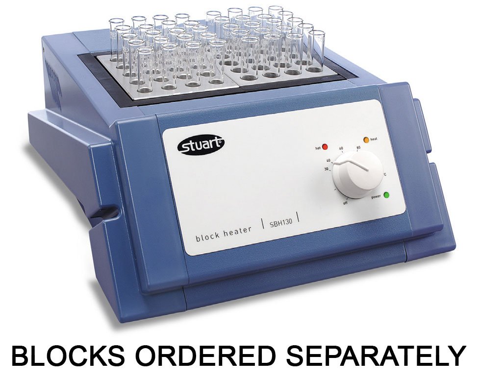 Stuart block heaters are designed to accurately control the temperature of test tubes and other small containers using heated aluminium blocks drilled with holes of the appropriate size for the containers in use. A large variety of blocks with different holes for different sizes and type of container are available.