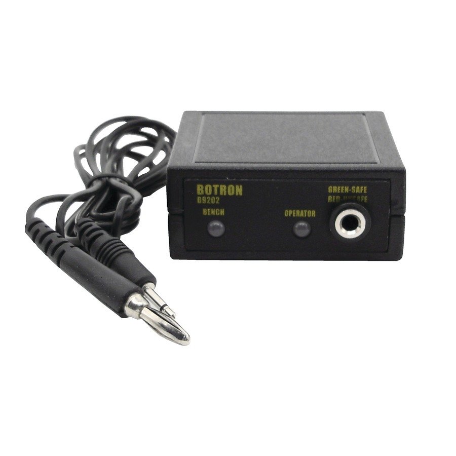 The Techni-Pro 758ST9202 is designed to monitor the resistance of both the work surface and the operator. It comes with a built-in audible alarm and LED, triggering when either the operator or work surface falls out of specs, becomes disconnected, or ground is lost. It is a fixed resistor system and is go-no-go; there is no calibration needed. A full-time monitoring system is necessary to reduce latency on the assembly line.