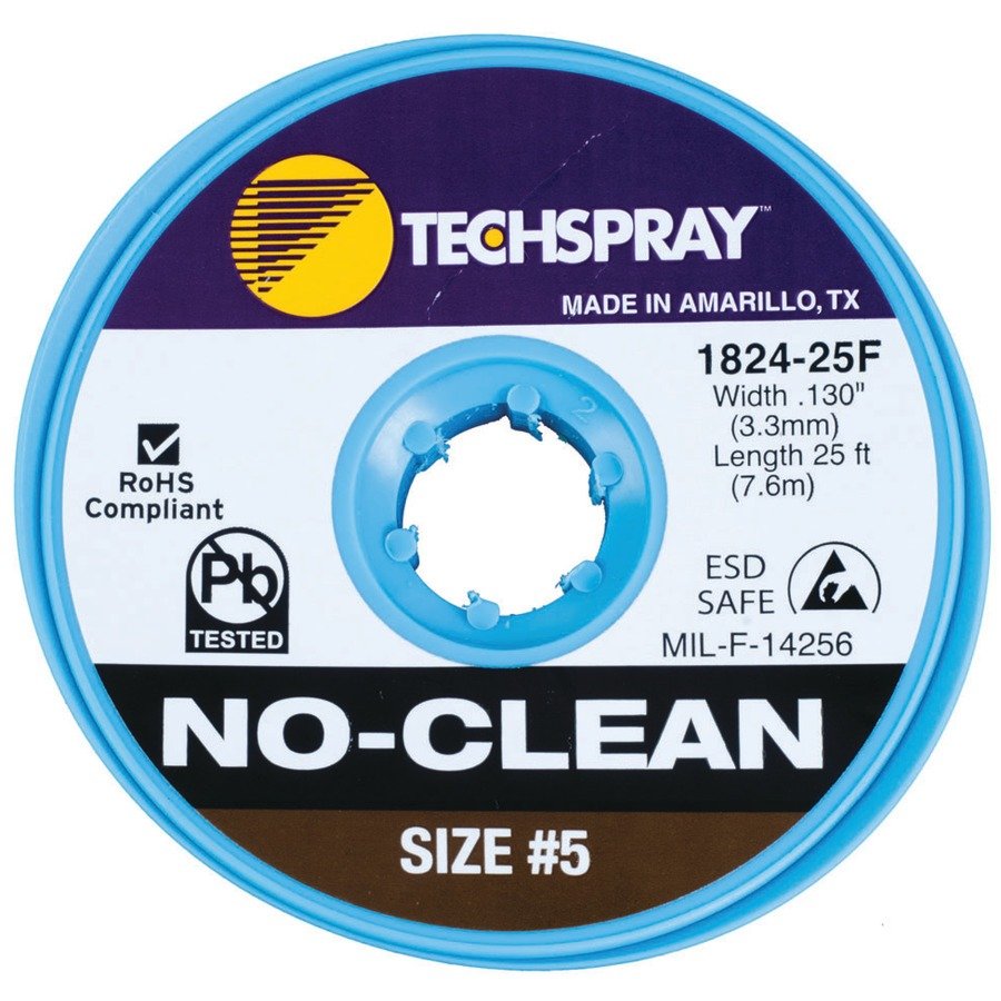 Desoldering Braid, No-Clean, ESD-Safe, 25 ft, Size #5, Brown Label