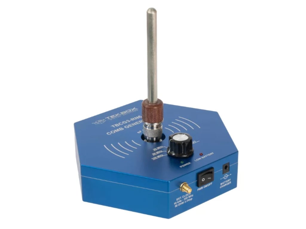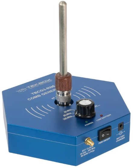 The TBCG3-RN6 comb generator is primarily intended for testing radiated emission setups. It is a useful tool for validating the proper operation of the antenna and pre-amplifier, as well as the accurate set-up and configuration of the spectrum analyzer. It is well characterized in an anechoic chamber and the radiated emission plots can be used as a reference to compare an EUT in a non-ideal setup against the comb generator in the same location.