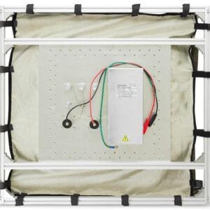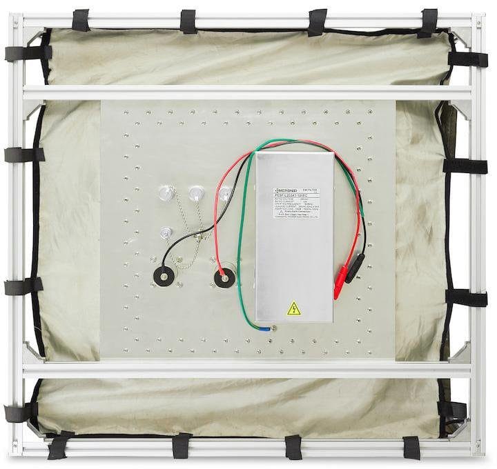 The TBST-200/100/100 shielded tent is designed to suppress interference from ambient noise when carrying out EMC pre-compliance measurements. The TBST200/100/100 has an external size of 7ft x 3ft x 3ft. The tent can accommodate any Tekbox pre-compliance test equipment such as LISNs or TEM-cells. The shielded tent is composed of two layers of conductive fabrics. It is supported by rigid aluminum profiles. The filter panel at the side provides a 240V/10A mains AC filter, two general purpose 240V/10A AC/DC filters and four coaxial feed through adapters with screw caps. The access opening is sealed with conductive Velcro tape.