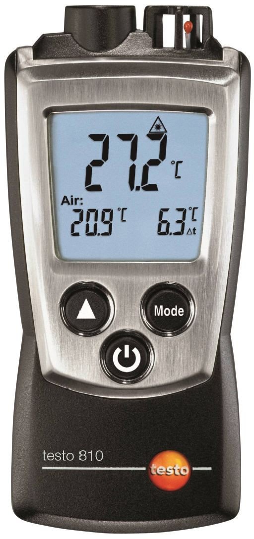 The testo 810 simultaneously measures ambient air and surface temperature via infrared sensors, at the touch of a button. For example, the testo 810 thermometer can take the non-contact surface temperature of a radiator or air vent, and compare it with the air temperature of the room at the same time. The testo 810 features a 1-point laser sighting and 6:1 optics ratio; it’s also very compact, convenient, and easy to operate.