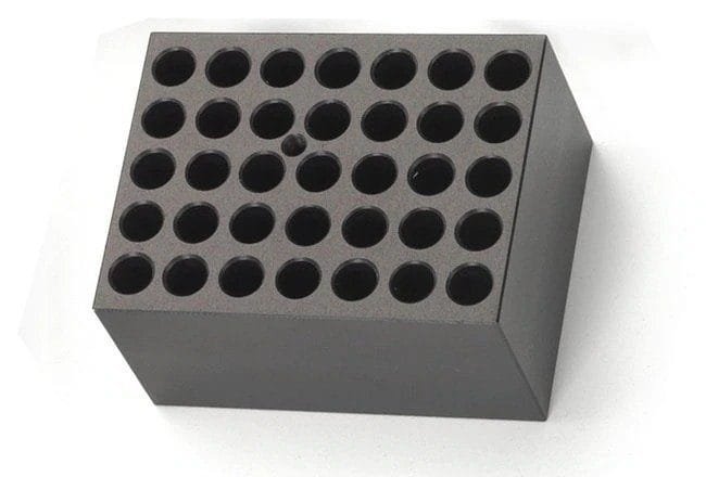 Aluminum alloy mounting block for holding up to thirty-five 10mm diameter tubes for drybath heating or cooling.