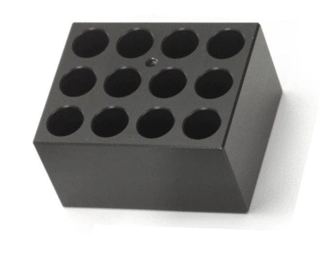 Aluminum alloy mounting block for holding up to twelve 18mm diameter tubes for drybath heating or cooling.