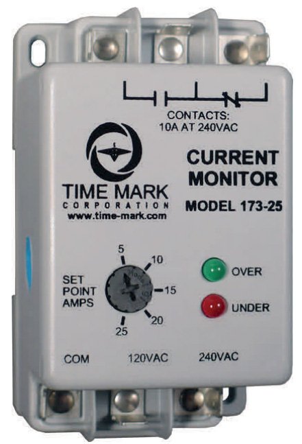 Two versions, either of which can be connected to 120 or 240VAC, are available. One for current ranges up to 5 amps, the other for applications from 5 to 25 amps. For currents above 25 amps, matching CT’s are available. The Model 173 is not frequency sensitive and can be used on AC currents from 50 to 400Hz. The compact housing can be surface or DIN rail mounted with 1/4″ quick connect terminals provided for input and output connections.
